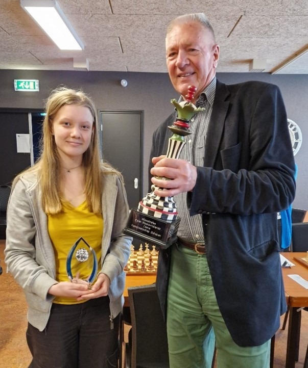 Jan Poland, voorzitter van de Noord-Hollandse schaakbond sloot de dag af met de prijsuitreiking aan Thera Woldhuis uit Hilversum, de Dame Kampioen van Noord-Holland 2025!