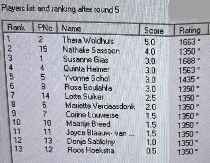 Het Open Dame Kampioenschap van Noord-Holland op 13 april 2025 was geslaagd én enerverend. Deelnemers waren van alle leeftijden, van 17 tot 81 jaar en kwamen uit heel Noord-Holland. We speelden vijf rondes Swiss Master, onder leiding van Etienne Bruere.
