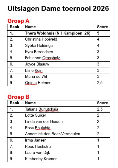 Schaakvereniging Warmenhuizen ’76 organiseert jaarlijks het Noord-Hollands Dame Kampioenschap schaken voor dames vanaf 15 jaar. Uit de evaluatie van het toernooi in 2026 blijkt dat de deelnemers zeer tevreden waren over het toernooi: we scoren een rapportcijfer 9,1!